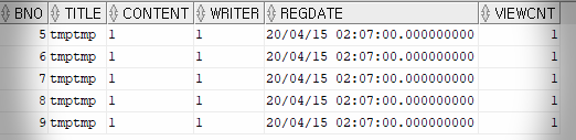 INSERT INTO tbl_board values(tmp_seq.NEXTVAL, 'tmptmp', '1','1',TO_DATE('20200415020700','YYYYMMDDHH24MISS'),'1');