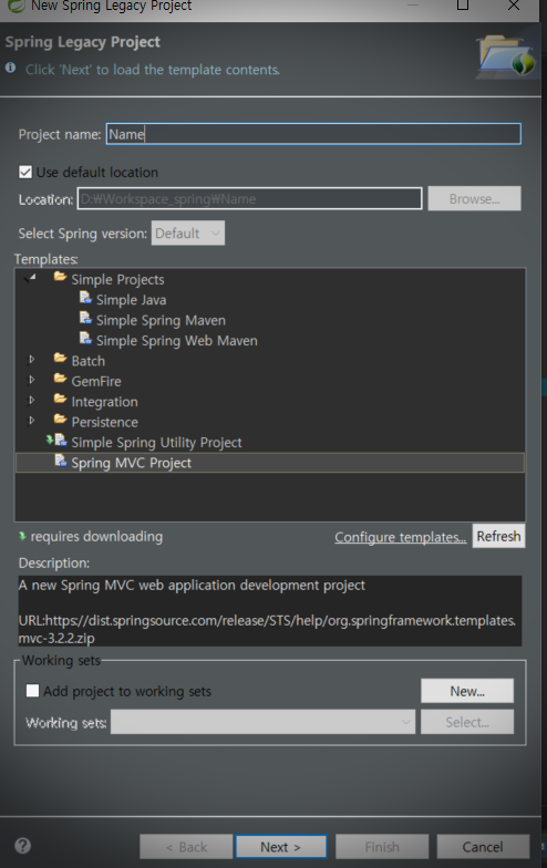 -> 프로젝트 이름 입력(Project Name) -> Spring MVC Project 선택 후 OK