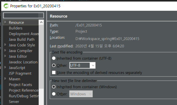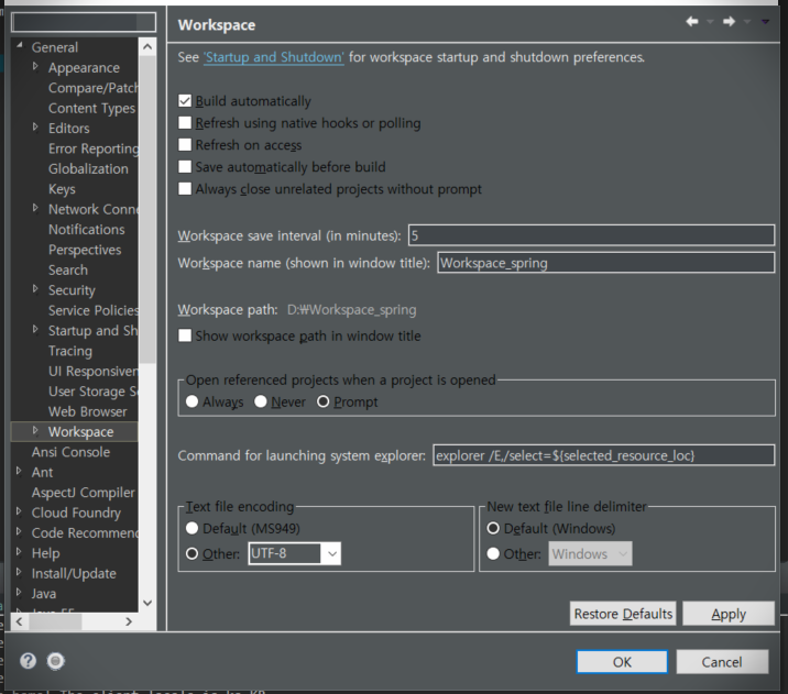 상단 메뉴의 Window -> Preferences -> General -> Workspace 인코딩 변경