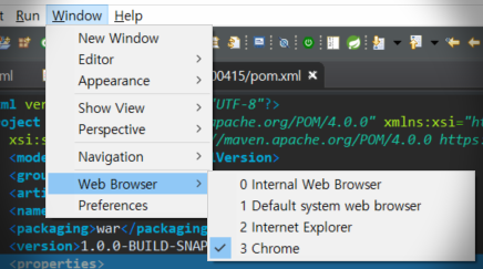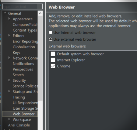 Window -> Preferences -> General -> Web Browser 에 설정을 바꿔주면된다