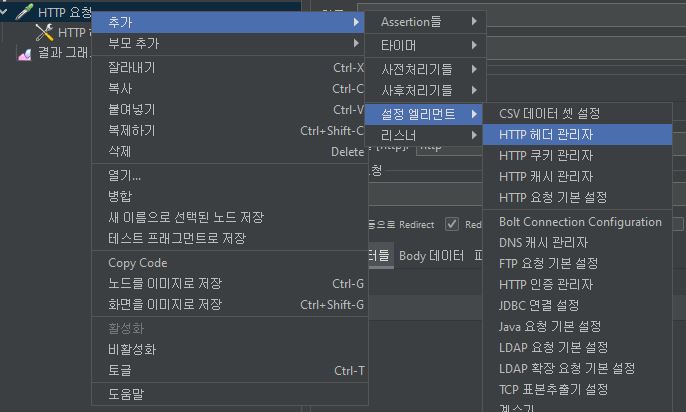 HTTP 요청에 HTTP 헤더를 추가하기 위해서는 HTTP 헤더 관리자를 사용해야 합니다. '스레드 그룹' 또는 'HTTP 요청'을 오른쪽 클릭하고 '설정 요소' → 'HTTP 헤더 관리자'를 선택하세요.