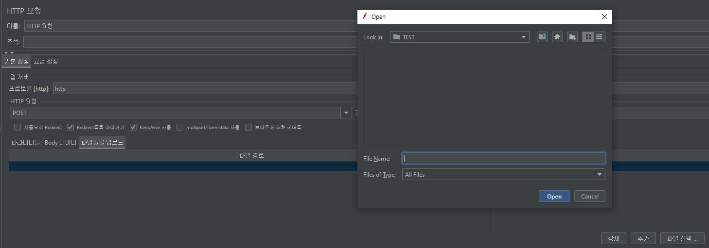 'Send Files with the Request' 체크박스를 선택하고, 파일을 추가합니다.