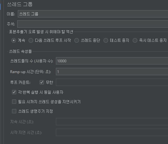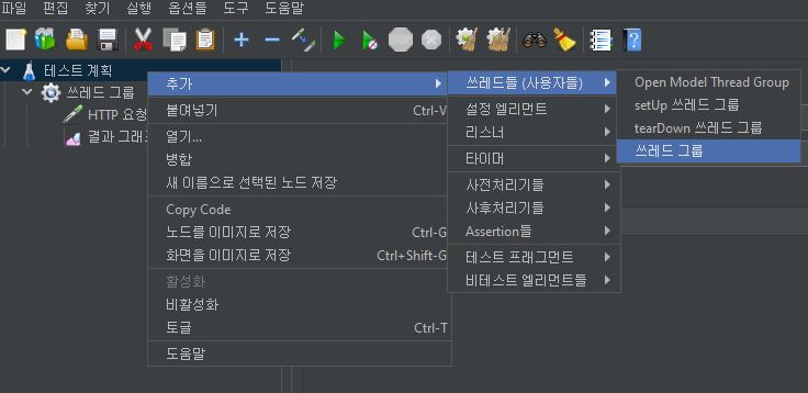 스레드 그룹은 동시 사용자의 수를 정의합니다. 테스트 플랜을 오른쪽 클릭하고, '스레드 그룹 추가'를 선택하십시오. 이 그룹 안에서 스레드 수(사용자 수), 루프 카운트(각 사용자가 테스트를 몇 번 실행할지), Ramp-Up Period(사용자가 시스템에 도달하는 시간) 등을 설정할 수 있습니다.