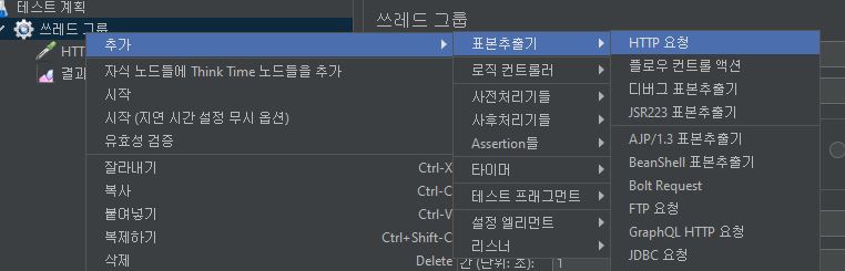스레드 그룹에 '샘플러' → 'HTTP 요청'을 추가합니다. 여기에서는 특정 서버에 어떤 종류의 HTTP 요청(GET, POST 등)을 보낼지를 정의합니다.