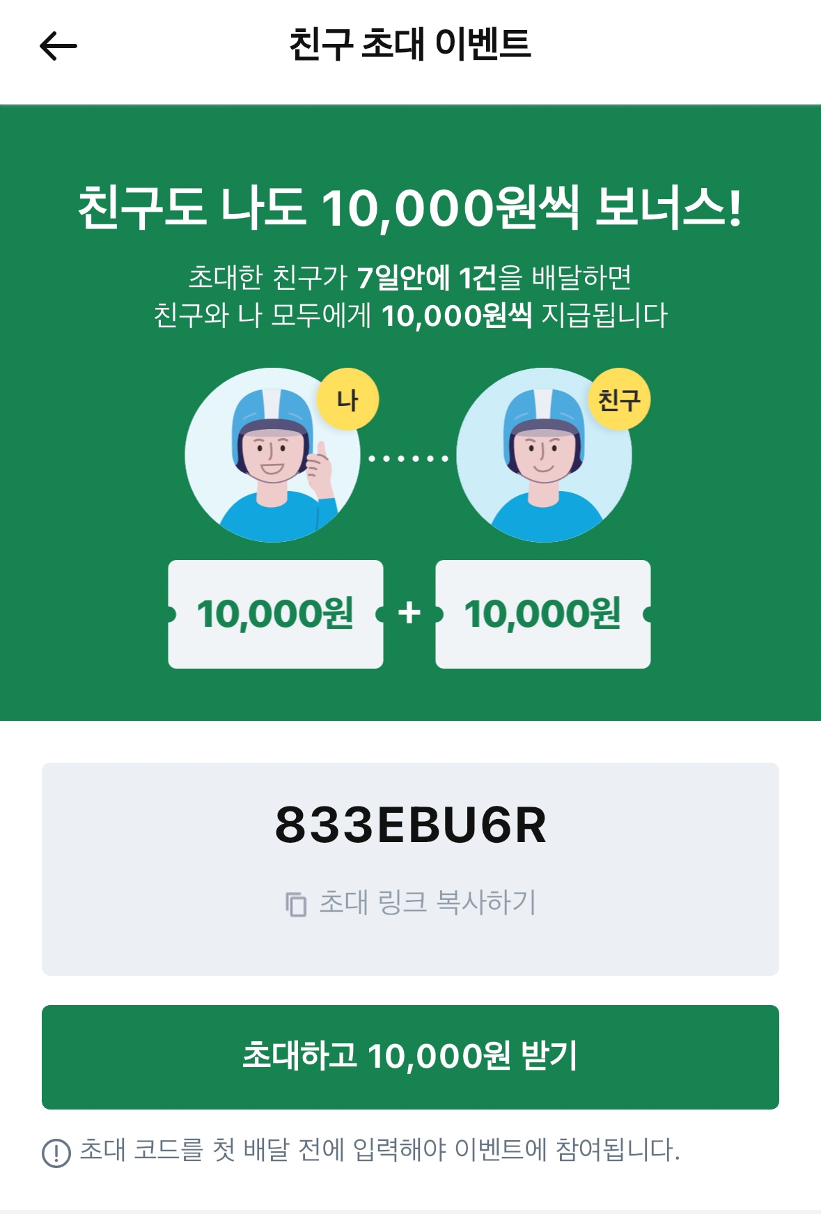 친구 초대 코드 입력 후 배달하면 1만원 보너스!